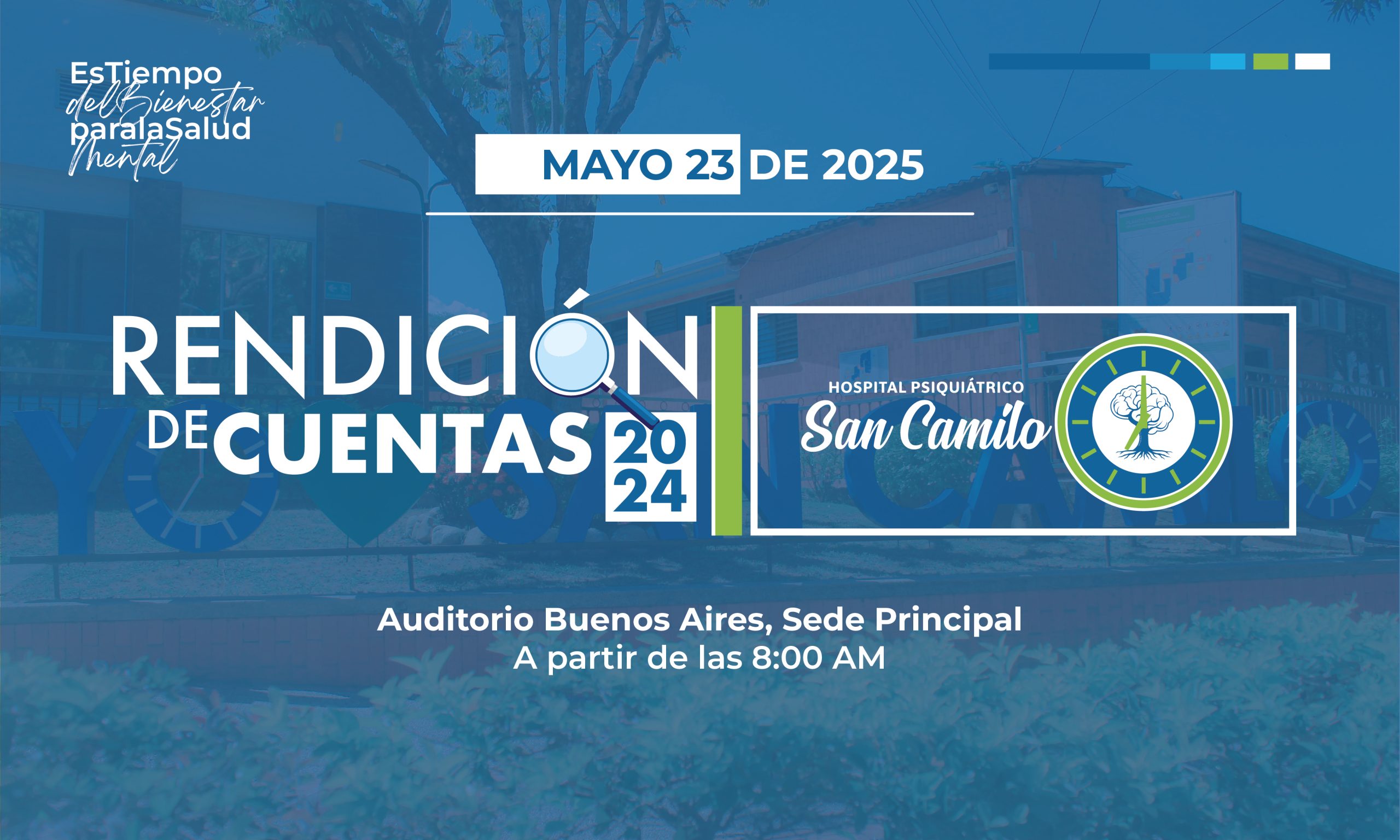 La ESE Hospital Psiquiátrico San Camilo invita a la ciudadanía, usuarios, organizaciones sociales, entes de control y demás grupos de interés a participar en la jornada de Rendición de Cuentas correspondiente a la vigencia 2024, la cual se llevará a cabo el próximo 23 de mayo de 2025, a partir de las 8:00 a.m., en modalidad mixta.