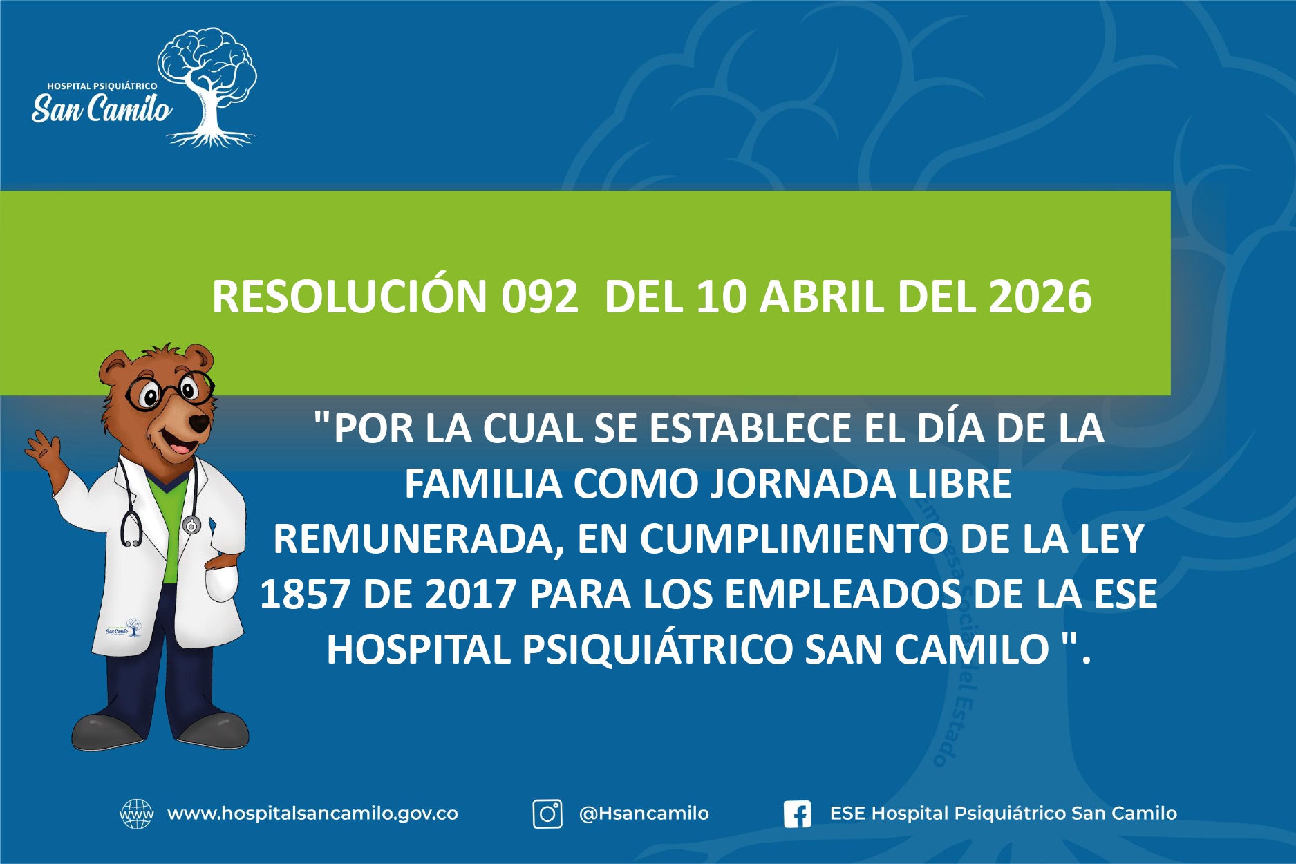 “POR LA CUAL SE ESTABLECE EL DÍA DE LA FAMILIA COMO JORNADA LIBRE REMUNERADA, EN CUMPLIMIENTO DE LA LEY 1857 DE 2017 PARA LOS EMPLEADOS DE LA ESE HOSPITAL PSIQUIÁTRICO SAN CAMILO”