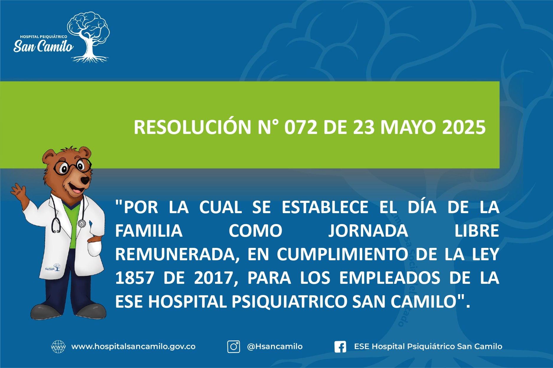 “POR LA CUAL SE ESTABLECE EL DÍA DE LA FAMILIA COMO JORNADA LIBRE REMUNERADA, EN CUMPLIMIENTO DE LA LEY 1857 DE 2017, PARA LOS EMPLEADOS DE LA ESE HOSPITAL PSIQUIATRICO SAN CAMILO“.