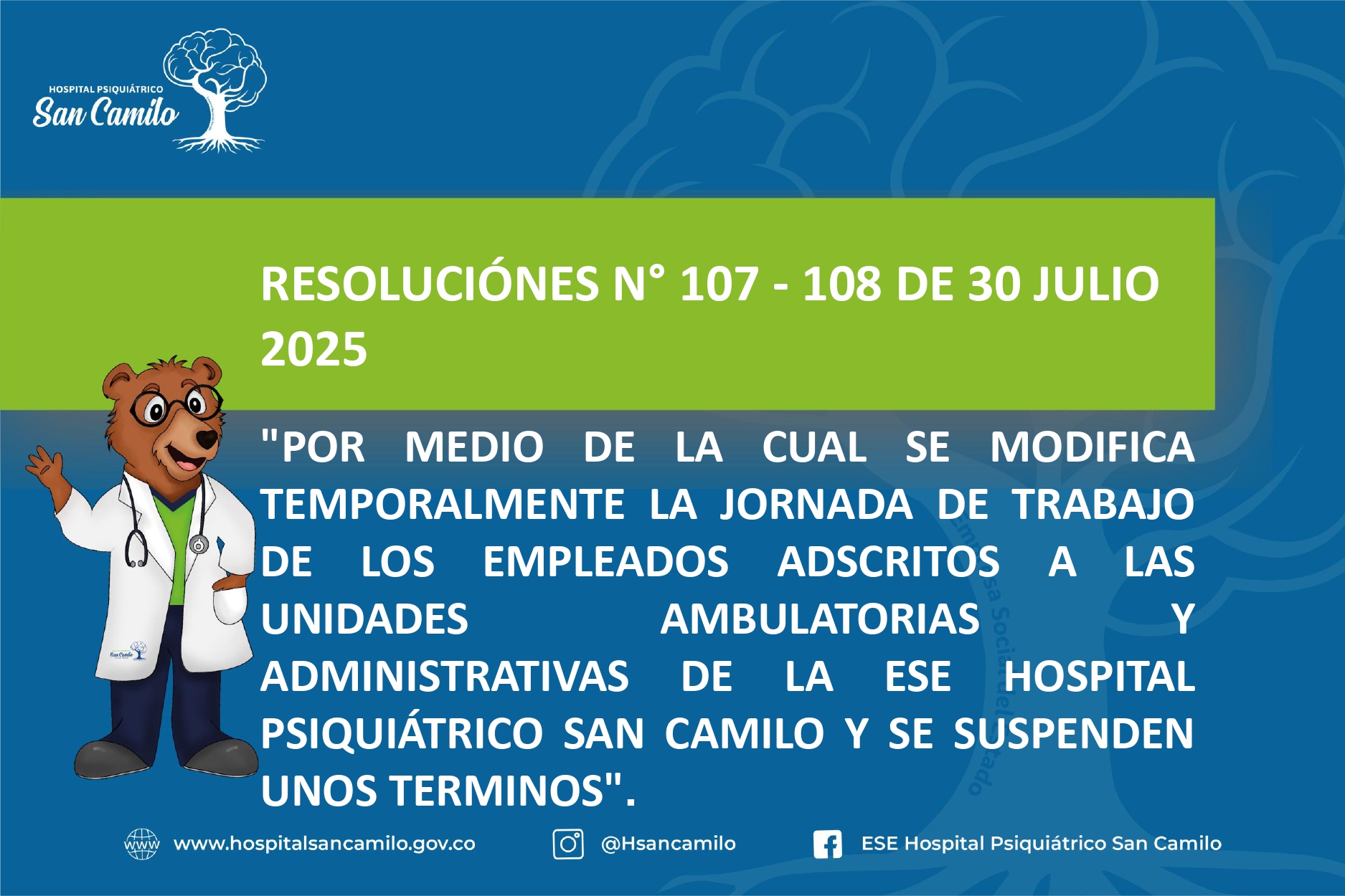 “POR MEDIO DE LA CUAL SE MODIFICA TEMPORALMENTE LA JORNADA DE TRABAJO DE LOS EMPLEADOS ADSCRITOS A LAS UNIDADES AMBULATORIAS Y ADMINISTRATIVAS DE LA ESE HOSPITAL PSIQUIÁTRICO SAN CAMILO Y SE SUSPENDEN UNOS TERMINOS”.